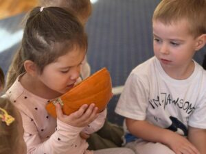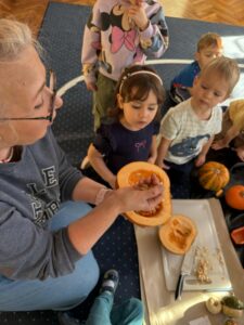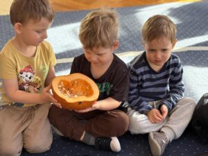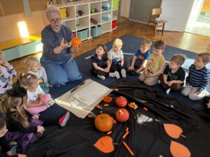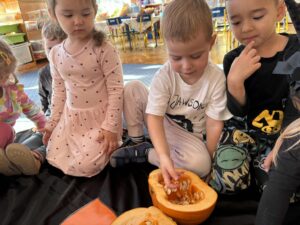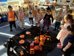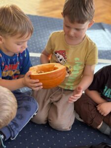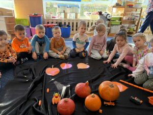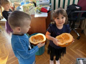 Podczas zabawy z dynią dzieci mogły odkrywać jej różnorodne zastosowania, kształty i kolory. Było mnóstwo śmiechu i radości, a wspólne zajęcia dostarczyły dzieciom wielu wspaniałych wrażeń.