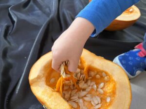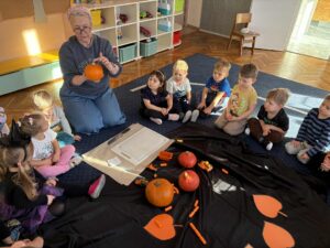 Były wyścigi w toczeniu dyni, ćwiczenia równoważne, rozmowy o emocjach po polsku i w języku angielskim 😉 przeliczaliśmy pestki dyni, a później zjedliśmy je na zdrowie.