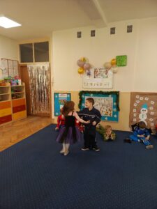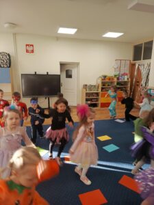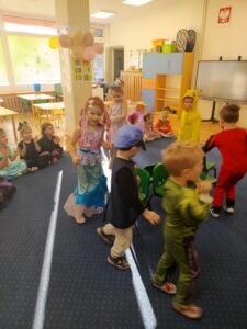 Podczas balu nie zabrakło radosnych pląsów, tańców w kole oraz zabaw integracyjnych. Dzieci chętnie prezentowały swoje stroje, biorąc udział w pokazie kostiumów. W przerwach czekał na nie poczęstunek, który dodał energii do dalszej zabawy.